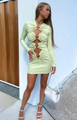 The signature form fitting with stretch Esber jersey, in a mini dress with panelled cut out front connected with a signature Esber brass detail