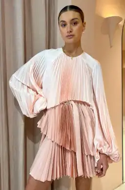 Delicately crafted from a silken to touch pleated fabrication in Gradient Pink hue.