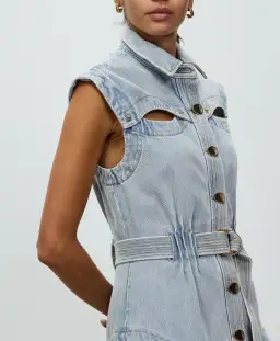 In a signature Acler silhouette the Blake Dress is an elevated denim mini dress with nods to vintage Americana. Crafted from a weighty cotton denim, this style features curved cut out details, luxe gold hardware, rustic button-down closure and an adjustable waist belt.