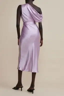 "A refreshing take on the classic midi dress silhouette ~ the Boise Dress in Lilac is a timeless piece. Crafted with the event season in mind, this style offers effortless dressing ~ drop shoulder, relaxed overall fit cinched at the waist with a re-imaged d-ring belt. Luxe gold hardware polished off this timeless silhouette"