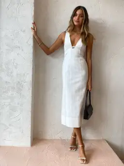 A considered silhouette this winter season ~ the Brooklake Dress in White is crafted from a tran seasonal natural blend fabrication. This style is designed to hug the body ~ elevated with tonal stitching, plunging neckline and attached waist tie.