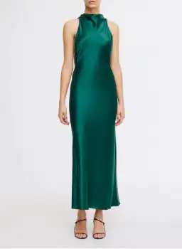 Crafted with the event season in mind, the Cadell Midi Dress in Emerald is a statement silhouette. Complimented with a cowl neckline, crossover strap detail through the back bodice and luxurious gold hardware.