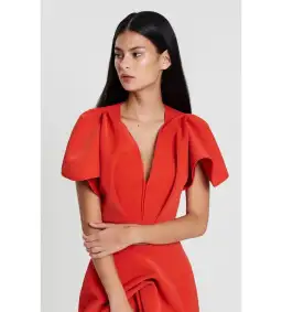 - Structured, tulip-inspired silhouette with a plunging neckline for an eye-catching statement
