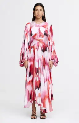Introducing the Dailley Midi Dress in Plum Watercolour, a piece that captures the essence of modern romance. The twisted bodice detail highlights the waist, while the pleated skirt cascades into an asymmetric hemline for a touch of drama. The low back and soft hand painted watercolour-inspired print create an unforgettable look, perfect for evening soirees or formal gatherings.