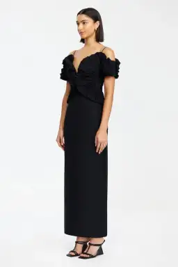 Introducing the Darnhill Midi Dress in Black, a bold yet romantic take on the classic black dress. Puff-like frill sleeves balance a figure skimming shape, while the bonded fabrication holds its form for a structured fit. Perfect for special events when you want to stand out, subtly.- Midi dress- Frilled sleeves & side panel details- Adjustable thin straps- CB invisible zip- Fully lined