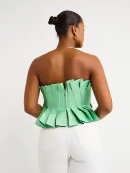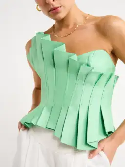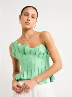 A stand out silhouette this season ~ designed with the event season in mind. The Davies Top in Mantis Green is a mindfully made silhouette ~ Bonded fabrication, pin and tuck detail, asymmetrical hem. Pleated fabrication adds texture to this structured style. Pair with the Davies Skirt for a complete look.