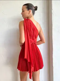 Luton one-shoulder mini dress from ACLER featuring scarlet, asymmetric design, fully pleated, draped detailing, knot detailing, one-shoulder, flared skirt and straight hem.