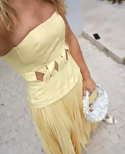 Introducing the Newbewick Maxi Dress in Lemon Sorbet, a modern take on formalwear. This sleek silhouette features a clean, minimalist design with a removable internal panel at the waist to reveal a cutout design or keep it buttoned for full coverage. This dress is finished with a center-back invisible zipper. Perfect for summer events or wedding guests, this piece blends elegance with versatility. - Maxi dress with - Removable internal panel - CB invisible zip