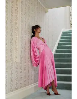 The Acler Palms Dress is a beautiful midi dress crafted from lightweight satin, featuring a fitted waist and open back detail. Its long balloon sleeves and asymmetric hem add a touch of elegance, making it ideal for formal events or a stylish evening out. The dress showcases signature Acler pleating and fabric manipulation, embodying a sense of 70s nostalgia.