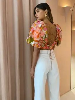 The Porter Top in Pink Bouquet is designed to be fitted at the bodice. This elegant piece features a sweetheart neckline, exaggerated sleeves and back cross over fastening.