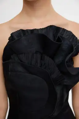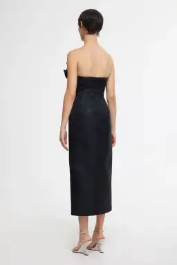 Structure is complimented with elegant design details ~ the Webster Midi Dress in Black Metallic was crafted with the event season in mind. A staple silhouette, featuring an accentuated side split for fluid movement and ruffle detail through the bodice.
