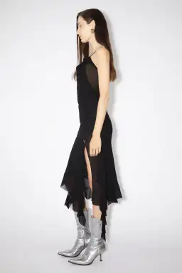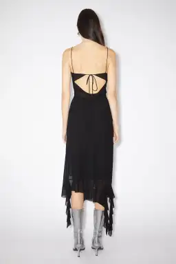 Acne Studios black strap dress is crafted from a fluid semi-sheer fabric with a frosted aspect, adorned with ruffle details and a front slit. Complete with a tie-up cut-out closure on the back. Cut to a fitted fit with a mid-calf length.