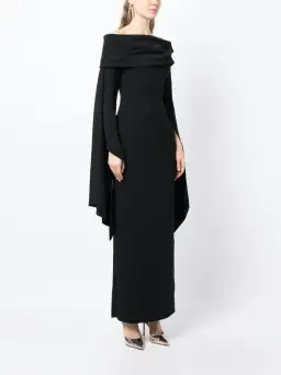 From Solace London, this evening gown offers a dramatic design. In a classic black colourway, it is cut to a floor-length silhouette and detailed with extra-long draped sleeves for a flowing feeling of movement.