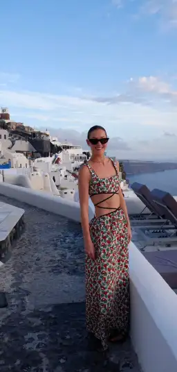 Gorgeous maxi dress with cutout at the waist. Buttons at the back of the bodice, elasticated at the top of the skirt