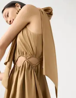 A midi dress designed for summer days cut in lightweight cotton poplin. The Henriette Tie Strap Midi Dress features a self tie halter neckline, asymmetric waist cut outs, and side seam pockets