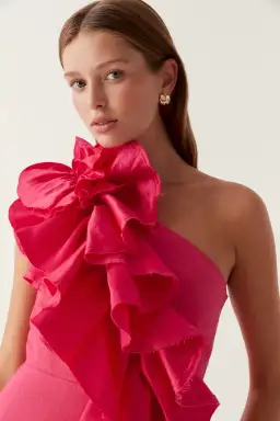 Aje Adelia Ruffle Midi Dress in Bougainvillea Red Pink