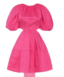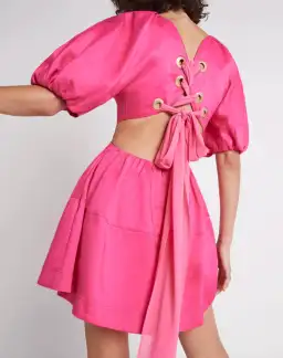 "A key season event piece, The Admiration Lace-Up Mini Dress presents a gathered neckline, architectural waist and back cutouts, and signature voluminous puff sleeves.