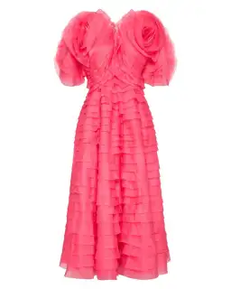 "Carefully crafted to imitate a rose, raw edged frills have been tiered throughout this midi dress. Aje signatures complete this style, including short puff sleeves, an underbust cut out and voluminous circle midi skirt."