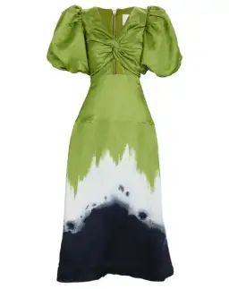 Statement midi dress features hand-painted ombre ink rendered on a silk-linen base, signature voluminous sleeve, cut out waist detail, full skirt and intricate twist bodice. Fastens with a back zip.