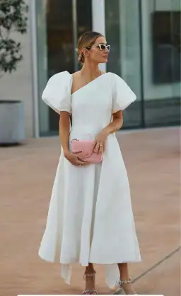 Floating sleeves and a fitted bodice create elegant dimensions in this party dress. Adding a sense of drama, shoulder ribbons fall from the one-shoulder neckline, following the flow of the full skirt. Wear yours with delicate chain jewellery.