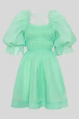 The dress comes with a voluminous gathered mini skirt, an open back with a lace-up detail, and an invisible zip at the center back of the skirt.