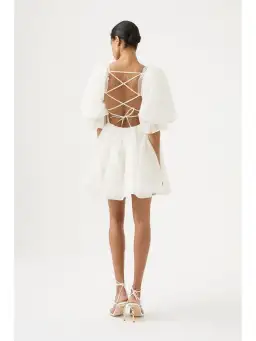 This whimsical mini dress boasts short blouson sleeves with fluted cuffs, a voluminous gathered mini skirt and a lace up open back. The romance continues with tiered ruching through the fitted bodice and frilled edging throughout.