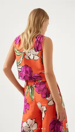 "This relaxed shell top features raw edging throughout and can be worn two ways - with the button closure down centre front or back. Style with the matching skirt in Vivid Camellia and bright heels for a tonal event look."