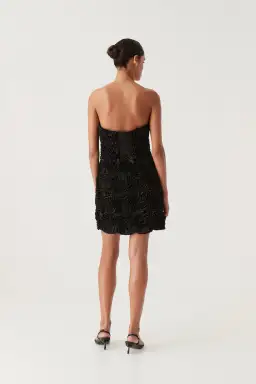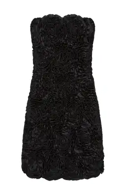 RRP $595. Mini length. Strapless neckline. Fitted bodice with internal boning. A-line skirt. Satin rosette appliqué throughout. Zip, hook and eye closure. Lined. 97% polyester; 3% spandex.