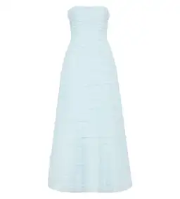 Our Aje Soundscape Maxi is a strapless dress with horizontal organza frills throughout. The dress has a fitted bodice with internal boning and a voluminous skirt.