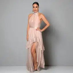 Stunning statement gown features an open back design, halter neckline with gathered frills, front side split and satin ribbon topstitch detailing. Fastens with an invisible zip at back. Zips and buttons all functional.