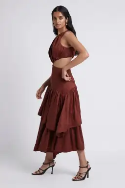 The Aje signature metal ring centres at the waist line with a cut out detail. A form fitting waist delicately transforms into a two tiered skirt. Style with a bold cuff on the wrist.