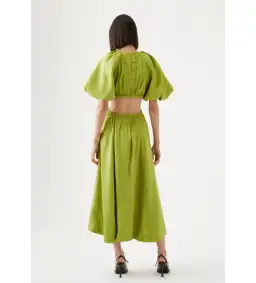 Mid-weight linen blend voile dress, midi length with elegant puffed sleeves and waist-defining cutout framed with braiding.