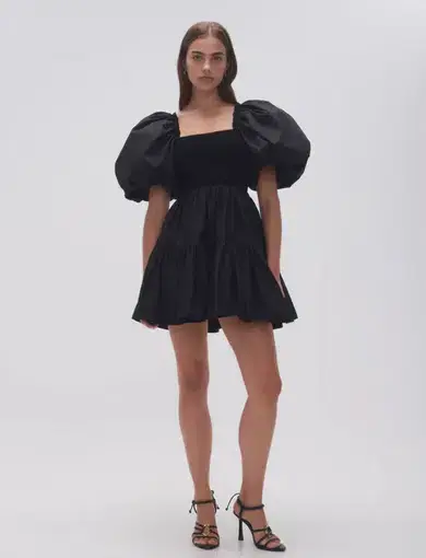 Mini length - Straight neckline with a shirred bodice - Tiered skirt layers - Signature Aje puff sleeve with exposed seams - Zipper closure at the back - Inseam pockets - 100% Cotton