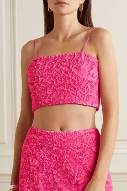 A cropped bodice featuring a square neckline, rouleau shoulder straps and sequins throughout. Pair with the New Catara Sequin Mini Skirt for a coordinated look at your next evening event.
