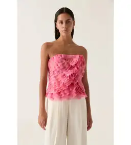 Make a bold, elegant statement with this stunning Aje two-piece set. The Charmed Rosette Bustier features dramatic layered ruffles, a strapless design, and structured boning for support. It’s perfectly paired with the Valeria Asymmetric Midi Skirt, which drapes beautifully with its soft bias cut and uneven hemline.