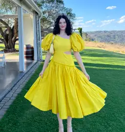 Stunning bright yellow dress. Striking statement piece for your next event. Wore to a wedding and was known by the aunties as “yellow dress dancing girl”. So comfortable, so much fun to wear.