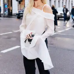 Stunning feminine long sleeved top with fluted cuffs. Airy blouse with an off the shoulder, twist strap design. Sold out design from '23 Aje season. Fits 6-8.