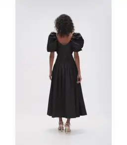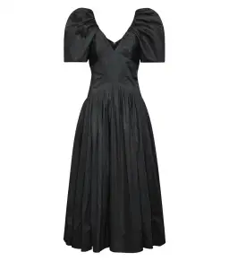 Midi dress with a wide V-Neckline with gathers and short puff sleeves. Fitted waist panels with a full gathered skirt and side seam pockets. Dress is lined and includes a zip up closure.