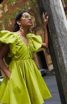 Fit-and-flare mini dress - Fitted bodice with deep scoop neckline and back - Short tulip sleeves - Exaggerated self tie at scoop back - Gathered throughout - Invisible zip at centre back skirt - Lined 100% Cotton Poplin