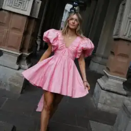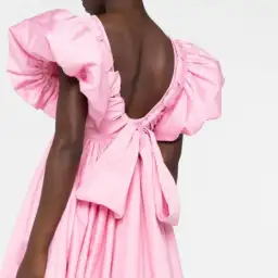 Show stopping dress features a fit-and-flare silhouette in a romantic ballet pink color featuring voluminous tulip sleeves, a deep scoop neckline and back, and a statement oversized drawcord tie at the back. Fully lined, fit true to size.