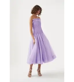 A beautiful soft lilac coloured midi dress with a pleated boned bodice, dropped waistline, and a flattering A-lined flared skirt. Finished with delicate straps and a double frill neckline, this piece pairs seamlessly with a heeled sandal or pumps.