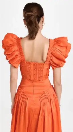 The Yves Midi Skirt, in a size 12, is crafted from an airy linen blend, this skirt offers a flattering high-waist silhouette with panels of intricate cartridge pleats that move beautifully as you do. The bright orange color is the perfect complement to the top, giving you a bold, stylish look that's perfect for any occasion.