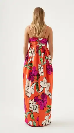 Spaghetti string maxi. Cinched bust with billowing skirt and slit down the centre. Bright floral print of orange, white, beige, fuchsia and green. Invisible zip on the back.