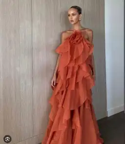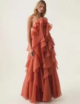 For rent. This captivating dress features a tiered, flowing silhouette that exudes effortless elegance. Its rich, warm coral clay hue is perfect for any season, while the voluminous layers create beautiful movement with every step. The dress boasts Aje's signature attention to detail with a flattering halter style neckline and delicate adjustable straps, making it ideal for weddings, formal events, or special occasions.