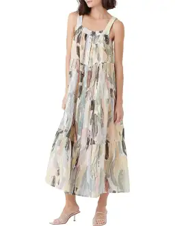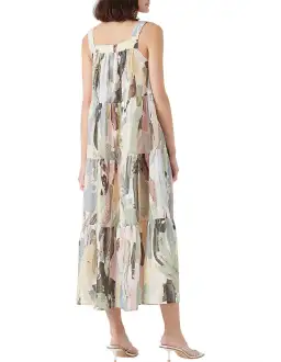 The Paperbark Tiered Midi Dress is a Paperbark printed, midi-length dress with wide straps and a functional button-down front. Square neckline, side seam pockets. Gold Australia button at neckline.