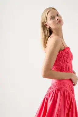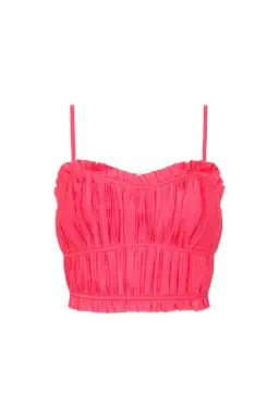"A cropped bodice with ruching, binding and frills throughout. Pair with high waisted pants and sandals for an effortless daytime look."