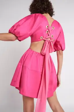 A key season event piece, The Admiration Lace-Up Mini Dress presents a gathered neckline, architectural waist and back cut-outs, and signature voluminous puff sleeves. Folded skirt gatherings and a curved open back complete with iconic lace up detailing finish this must-have style.