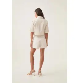New Season Aje Ren Set. Cropped shirt with embroidered details. Boxy fit with wide sleeves and Aje signature gold buttons. Denim shorts with twin belt loops and Aje signature gold button. Leather logo patch on the back. Stunning white denim set perfect for spring and summer