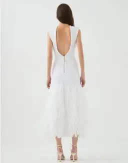 Elevate your look with this sleek white knitted dress. Designed with subtle, small shoulder pads for a soft structured silhouette, it also features a daring low back for a chic touch of elegance. The gold zipper detailing adds a hint of luxury, while the raffia bottom introduces an interesting texture contrast. Perfect for any occasion, this dress offers a stylish balance of modern edge and refined charm. The raffia bottom is made for movement, and looks magical while in motion.