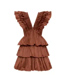 The Aje Rhythmic Frilled Mini Dress in brown is a bold and feminine mini dress featuring a deep V-neckline, wide shoulders, and statement frills across the chest and skirt. Made from lightweight fabric with a fitted waist and flared silhouette, it’s perfect for special occasions like weddings, race days, or parties. An invisible back zipper ensures a seamless fit, and the dress is fully lined for comfort.